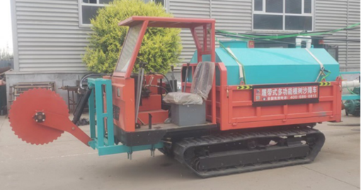 设计原理:履带式多功能植树铺设机在工作时由柴油机提供动力,履带行进,通过压草碾轮碾压在稻草中间向前移动,稻草下方会出现一条15-25厘米深的沟壑,稻草则在碾轮和沟壑的作用下,形成一堵能阻挡风沙的沙障。配置高压水泵,实现喷灌、滴灌、高压水打孔植树绿化;配置履带式底盘,适用于40度以内的沙坡,机械液压推杆控制压盘升降,提高下压能力,通过操作转向手柄转换方向,转向灵活,操作简单便捷,省时省力。