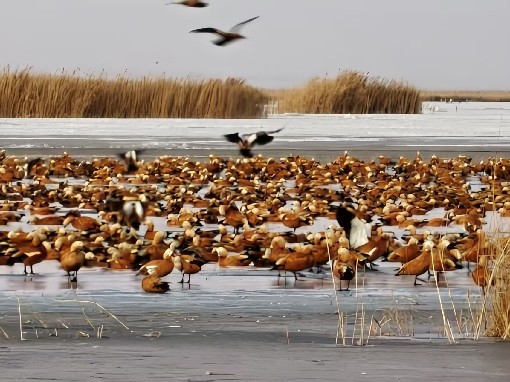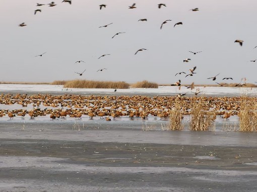 其中,赤麻鸭种群表现尤为突出,数量庞大,成为本次调查中的优势物种。具体监测数据显示:乌毛计调查点监测到赤麻鸭种群数量达 12,000余只,坝湾调查点监测到赤麻鸭数量约 2,000余只,沙尖子调查点监测到赤麻鸭数量约 2,000余只。仅以上三个调查点记录的赤麻鸭总数已近2万只,充分表明了乌梁素海湿地是赤麻鸭等越冬水鸟的关键栖息地,其丰富的食物资源和相对适宜的越冬环境吸引了大量水鸟聚集。
