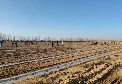 在技术人员的指导下,大家分工协作、默契配合,运苗、放苗、培土、压实,一棵棵酸枣苗在地膜上散布开来,逐渐成行成带成片。